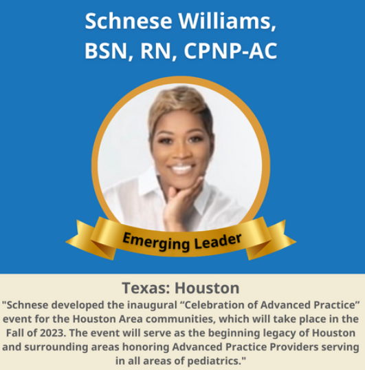As the National Association of Pediatric Nurse Practitioners prepare to celebrate 50 Years as the leading organization focused on Pediatric Education and Advocacy for Children, the organization took time to recognize emerging leaders in both local chapters and special interest groups. Chapters leaders and Special Interest Groups leaders were challenged with identifying a member who contributed to the 50 Forward theme of the organization leading into the 50 Year Anniversary. The Houston Chapter was honored to have 3 current Board Members chosen to be recognized at the 50th Anniversary Gala and Awards Reception being held in March 2023 as Emerging Leaders. Current Houston Chapter President, Jennifer Mauney was selected by the Children in Disasters SIG, Current Houston Chapter Treasurer, Traci Gonzalez was selected by the CYSHCN (Children and Youth with Special Health Care Needs) SIG and Current Houston Chapter President Elect, Schnese Williams was selected by the Houston Chapter leaders to be honored at the first NAPNAP Gala! Please congratulate these current board members on their recognition and stay tuned for their upcoming projects which helped them earn these recognitions. To see all of the Emerging Leaders throughout NAPNAP please visit www. NAPNAP.org and click on the icon in yellow- 50 Forward!